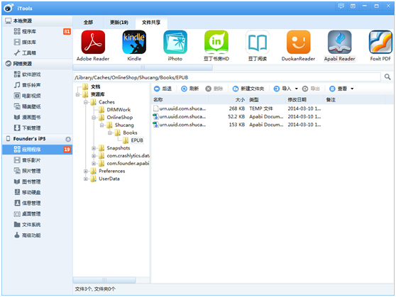2)书仓或其他第三方OPDS书店借阅的图书,使用iTools等第三方苹果助手工具访问存储路径,将下载的文件导出即可;