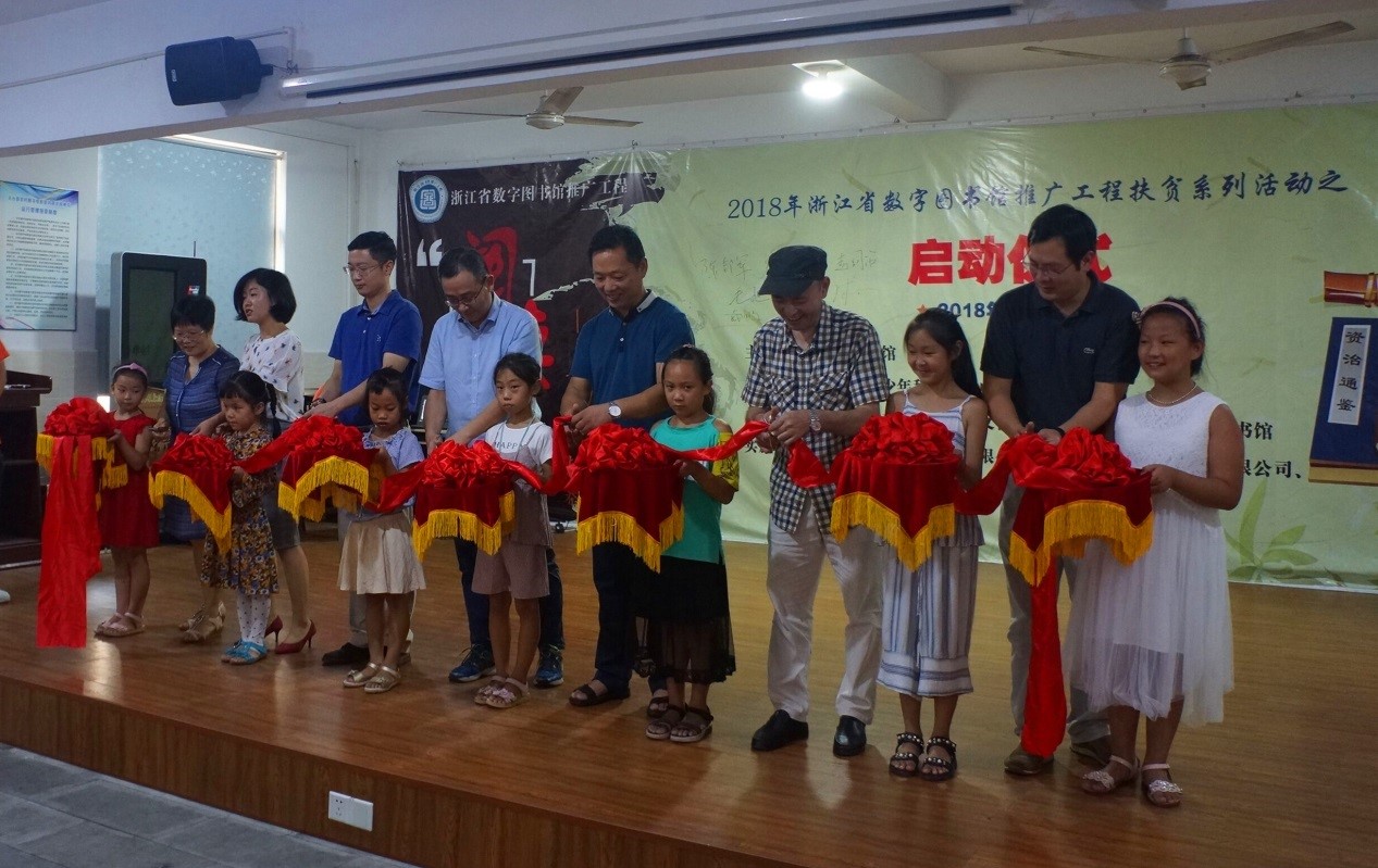 活動(dòng)現(xiàn)場,天臺縣文化廣電新聞出版局副局長陳邦軍、浙江圖書館工會主席詹利華、浙江省青少年科技活動(dòng)中心部長趙國治、臺州市圖書館館長毛旭、天臺縣圖書館館長王水球、北京方正阿帕比技術(shù)有限公司經(jīng)營中心副總經(jīng)理戴鵬、五洲融媒體科技股份有限公司副總經(jīng)理?xiàng)钊粸榇舜位顒?dòng)攜手剪彩。